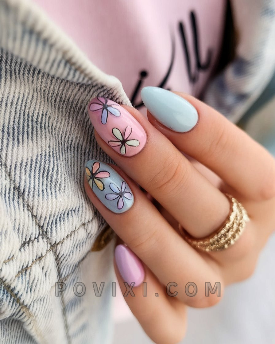 This set presents retro-style daisies through cartoonish flowers placed on a baby blue background with lavender and blush pink tones that create a cheerful design. The nail style appeals to Gen Z and Millennial tastes with its fun and flirty features. A velvety matte finish creates dreamy effects in this palette, which is suitable for both light and medium complexion wearers. A 2025 summer style can be achieved by wearing pastel nails with candy-colored accessories.