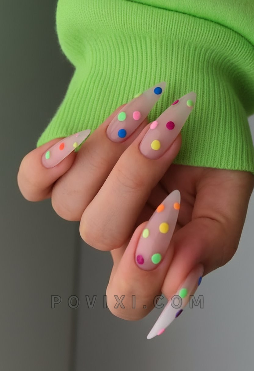 Matte gel nails are the top summer party trend this season. A milky nude canvas showcases neon lime green with hot pink and orange and purple dots for confetti-effect nails. Oval and almond-shaped nails benefit from this trendy design, which is suitable for birthdays, Pride events and random occasions. The nail design requires a special look to complement it when worn, so pair it with solid colored clothing to make your hands stand out.