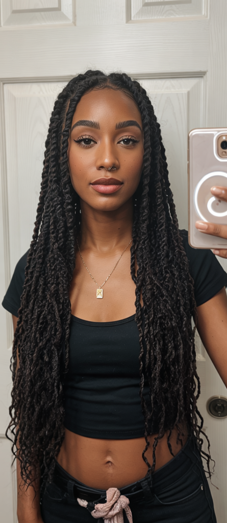What a feeling of power you get when you wear long twist braids. They are full of sophistication and style and are ideal in cases when you desire to appear not only traditionally but also modern. The length gives it a dramatic feel and the twists themselves give it a gentler, rope-like texture that is flattering in all positions.