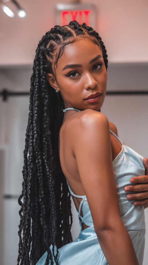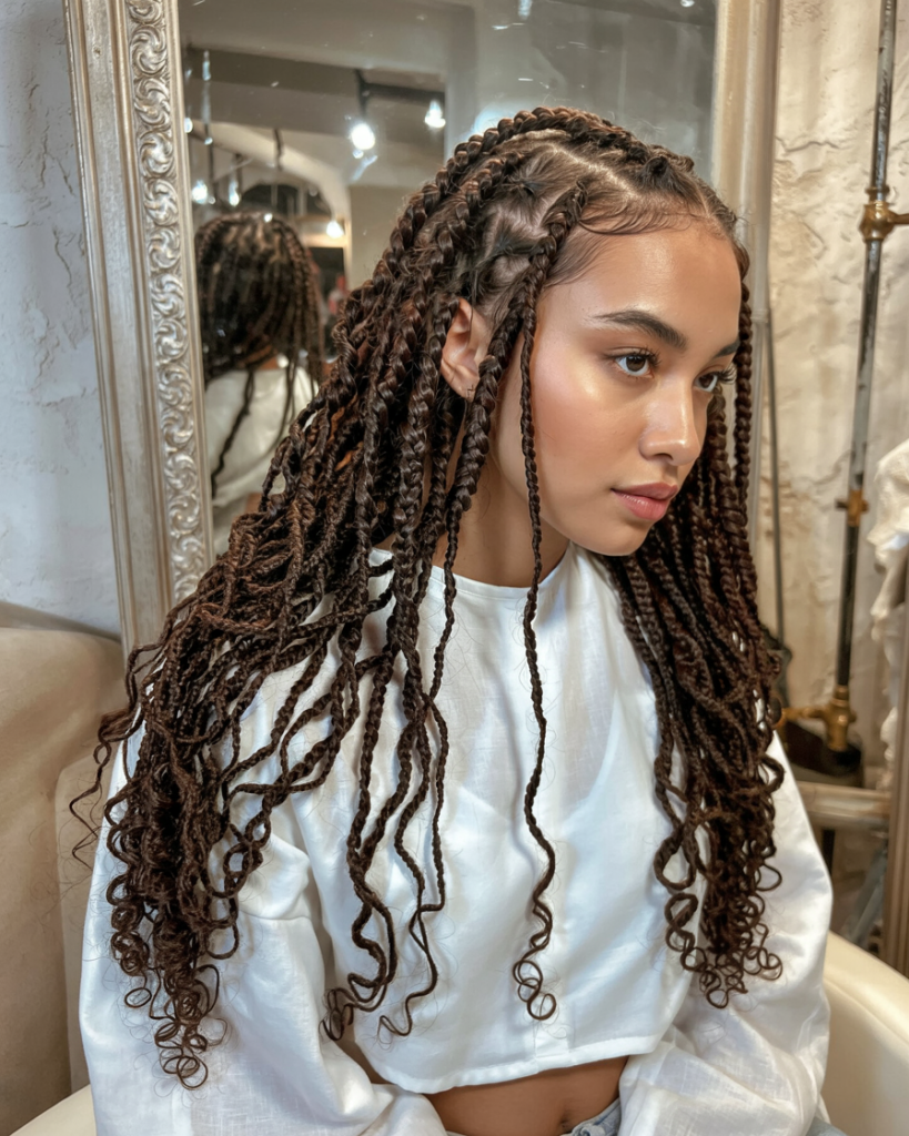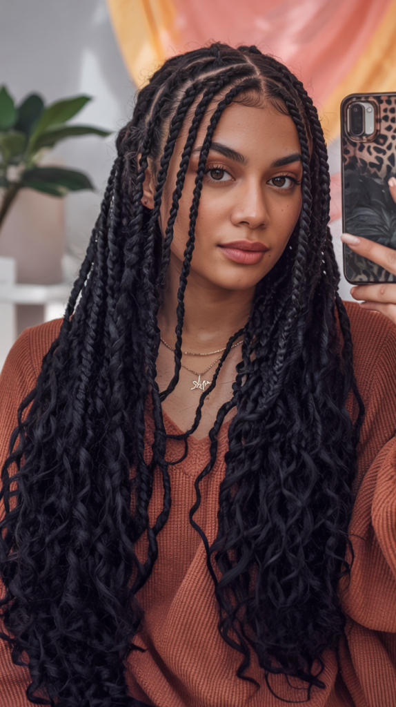 Best suits natural black hair and those ladies at the need to have a protective but glamourous style. These braids long curls are dramatic and voluminous compared to braids short styles, and hence a favorite protective hairstyle in 2025.