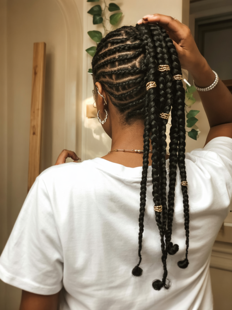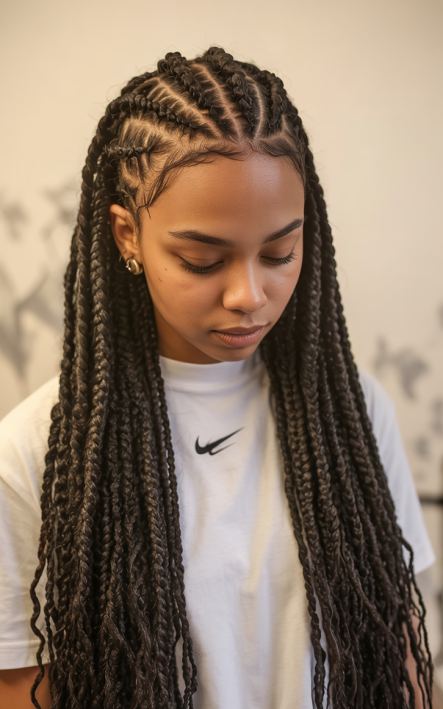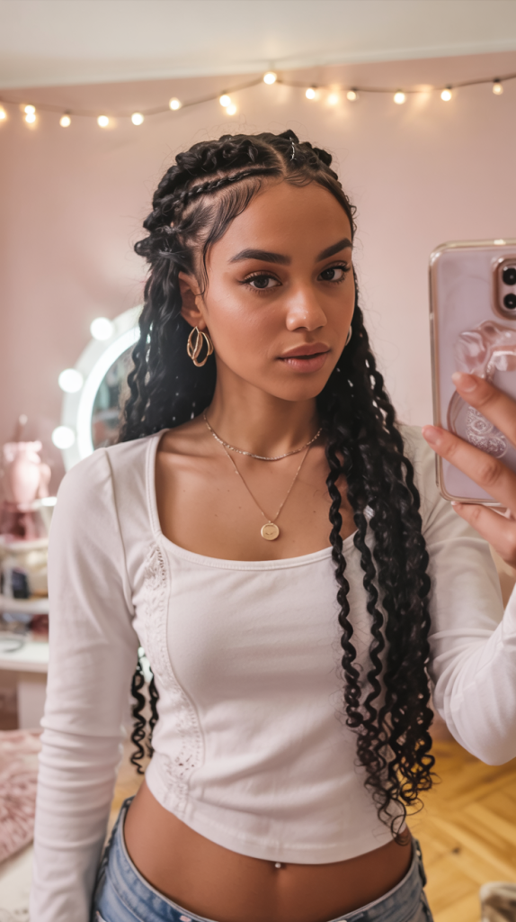 It particularly matches on natural black hair since it combines protective braiding with long free hair. The curls add vivacious softness as compared to the short styles of braids. This is a B4 2025 must-have protective hairstyle.