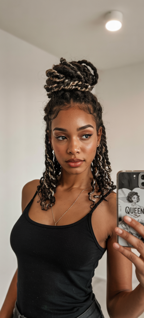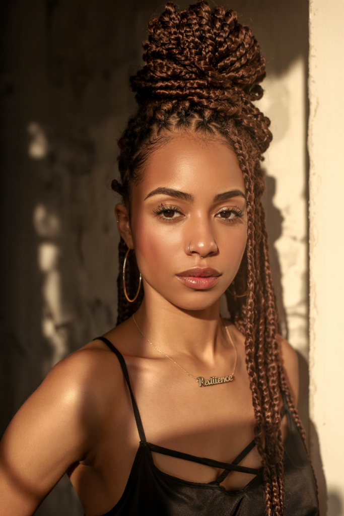 Box braids in a high bun have a feeling of power and glamour simultaneously. The bun is like a crown, not only makes you look like royalty but is also useful when it is hot or on busy days. It is protective and elegant and this is why it is one of the favorite choices every year.
