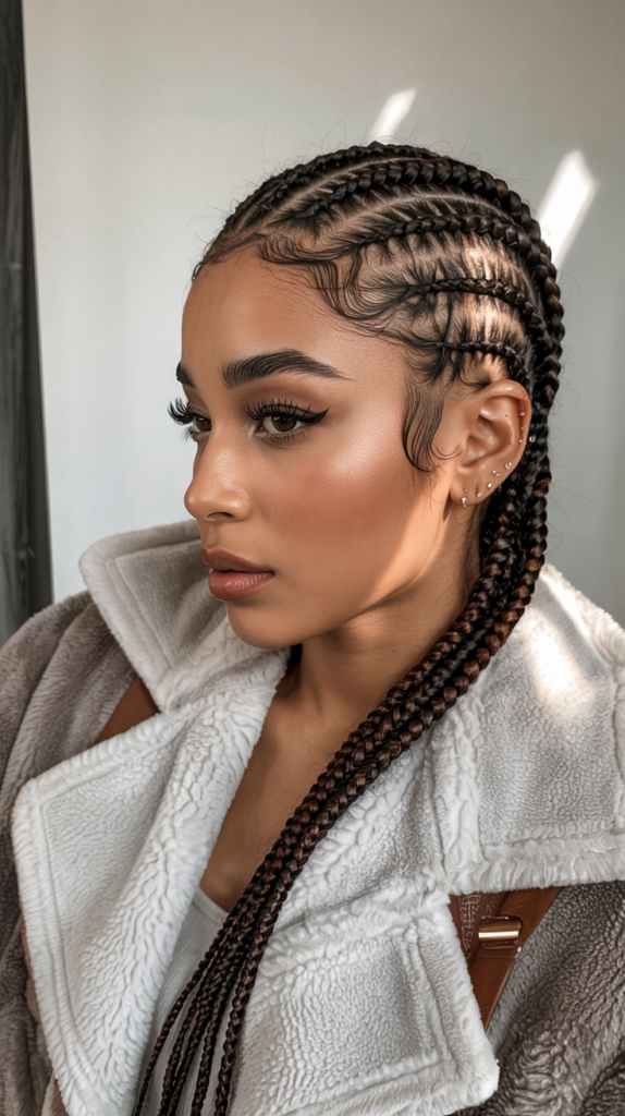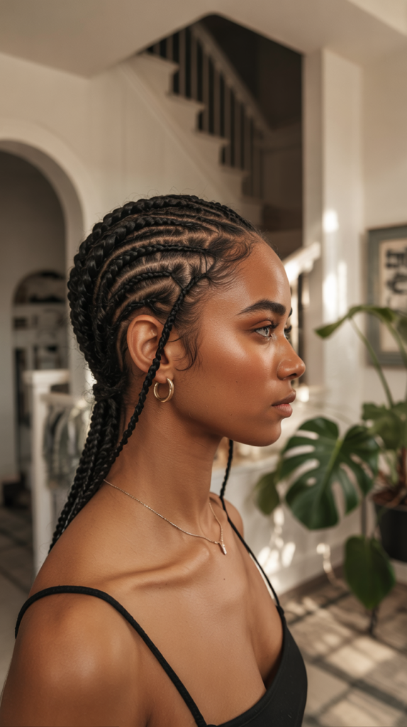 This protective style is best suited to natural black hair and it keeps everything in place with minimum maintenance. In comparison with the braids straight or less tight designs, the neat finish puts it in timelessness. In 2025, it is a place that women prefer the defined, neat styles.