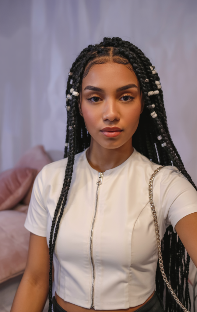 Sleeek, chic and easily worn, shoulder-length box braids. They set the face in a very beautiful manner without being cumbersome since the weight is light and manageable with ease on a daily basis. Incorporate some hair accessories and you are ready.