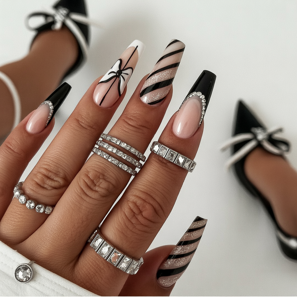Bold black meets clean white and in this elegant winter short almond set. The stripes and delicate bows channel a gift-wrapped aesthetic that’s simple yet statement-making. There’s a timeless appeal here—almost like a chic cashmere sweater turned into nail art.