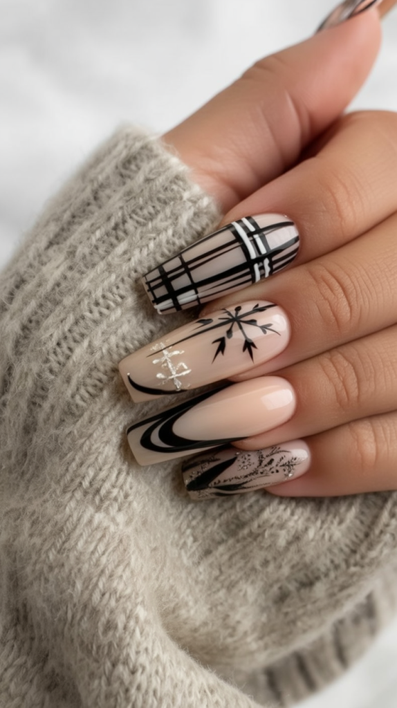 This set combines soft nude tones with black plaid, delicate snowflake art, and sweeping lines for a look that’s both cozy and polished. It feels like your favorite winter sweater translated into nail art—warm, stylish, and perfect for the season.