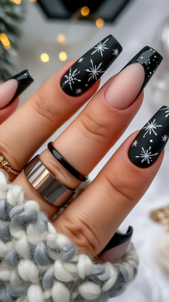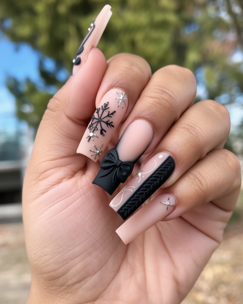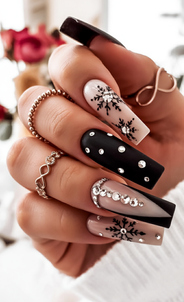 If sparkle is your love language, this black and nude set with snowflake accents and rhinestones is pure winter glamour. The contrast of matte black, sheer pink, and glistening crystals captures the festive spirit perfectly—think twinkling lights and champagne toasts.