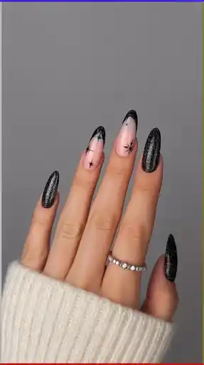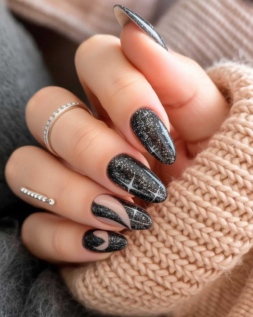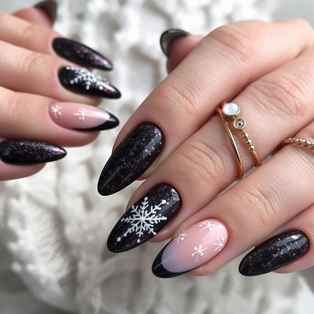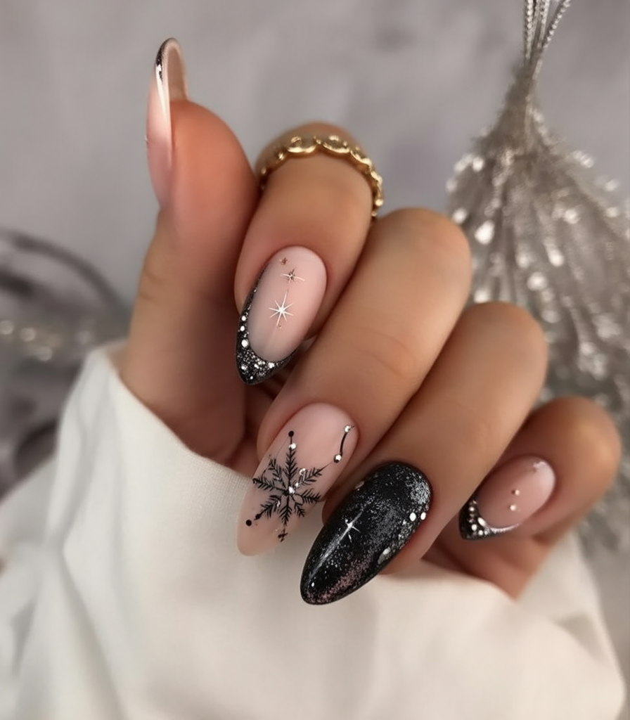 This winter almond design combines black, nude, and silver and glitter in a way that feels both delicate and sophisticated. The snowflake and star accents bring a festive sparkle, while the subtle gradients keep it classy—not flashy.