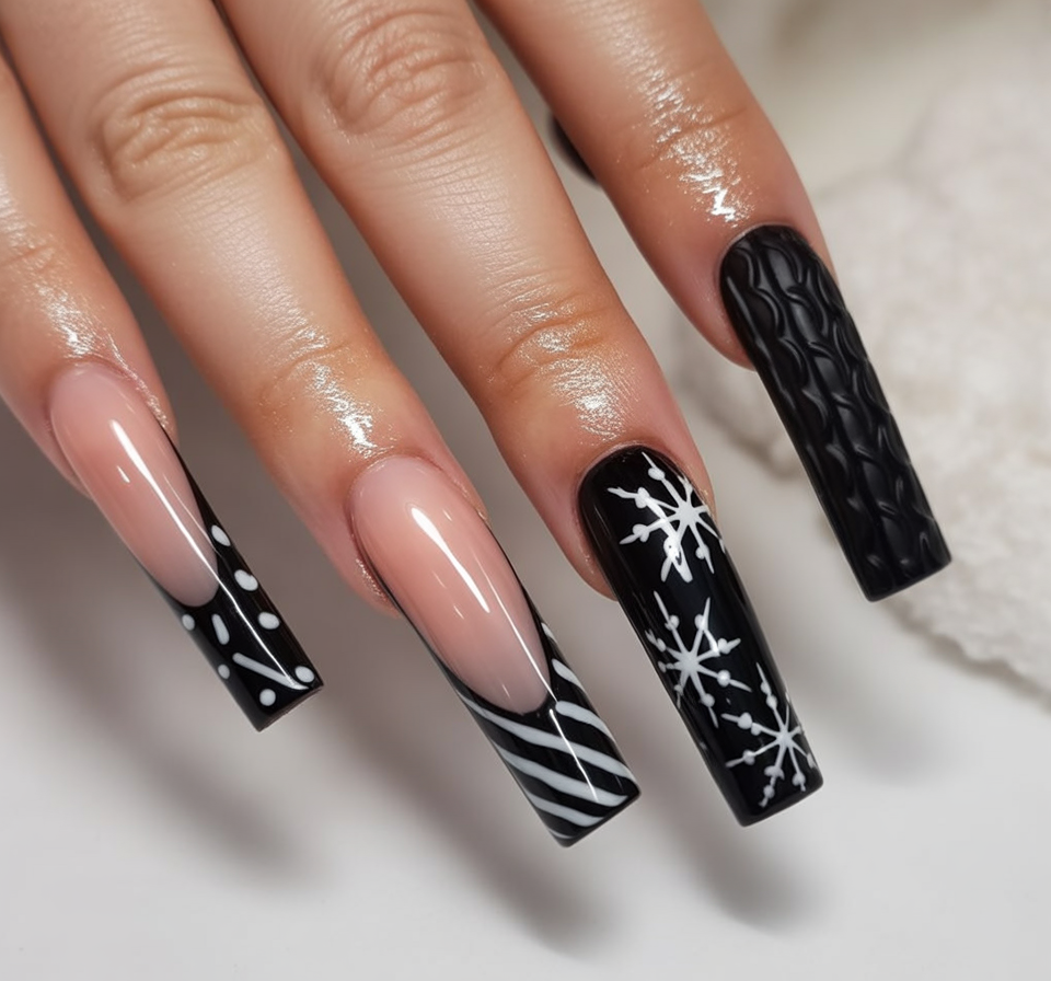 This black and white and set gives a stylish nod to classic holiday designs with snowflakes, stars, and a cable knit accent. It’s playful yet elevated—perfect for those who love mixing textures and patterns in their nail looks. The matte finish makes every element pop beautifully.