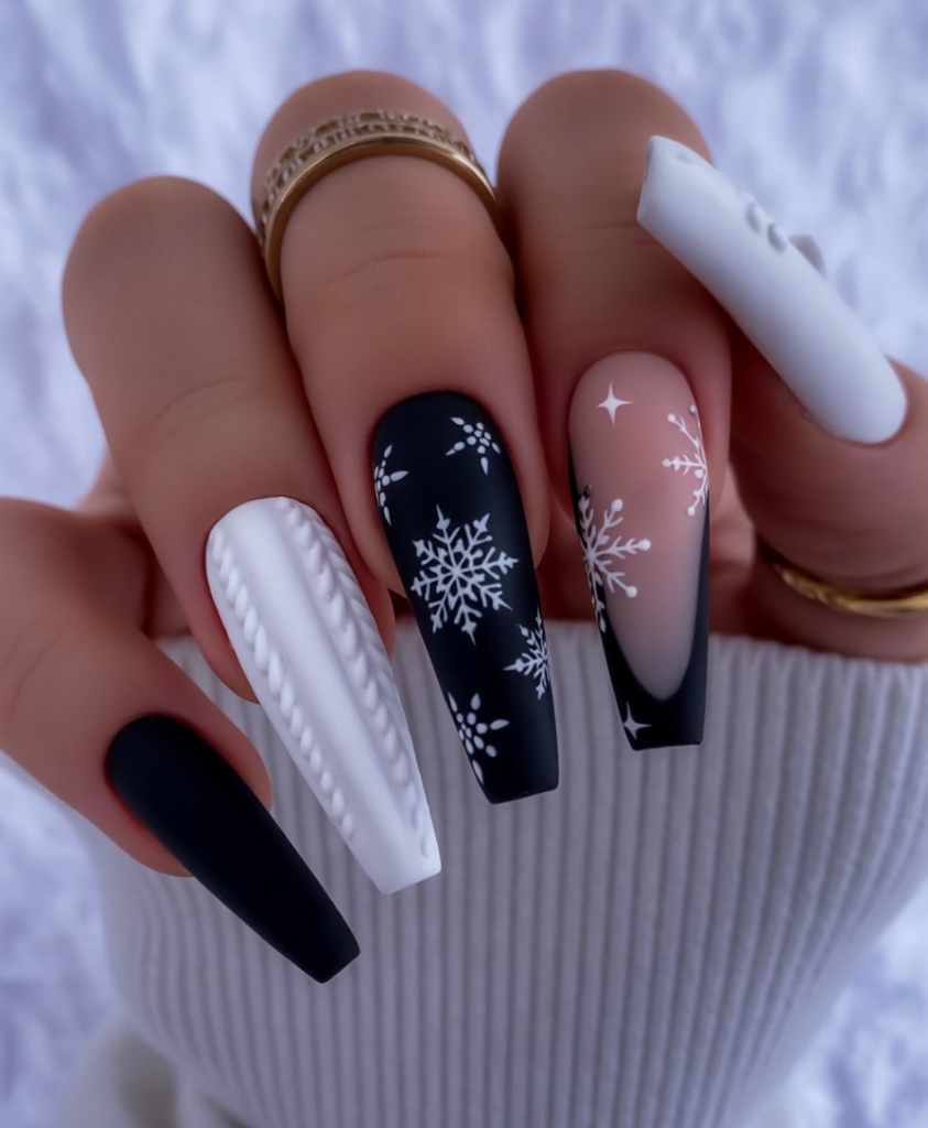 This look is best suited for long nails, especially the coffin type, where there really is room for some fine winter art. In short, it is bold yet classy. Simple wardrobe choices like cozy knits or sleek black dresses allow your nails to do all the talking.