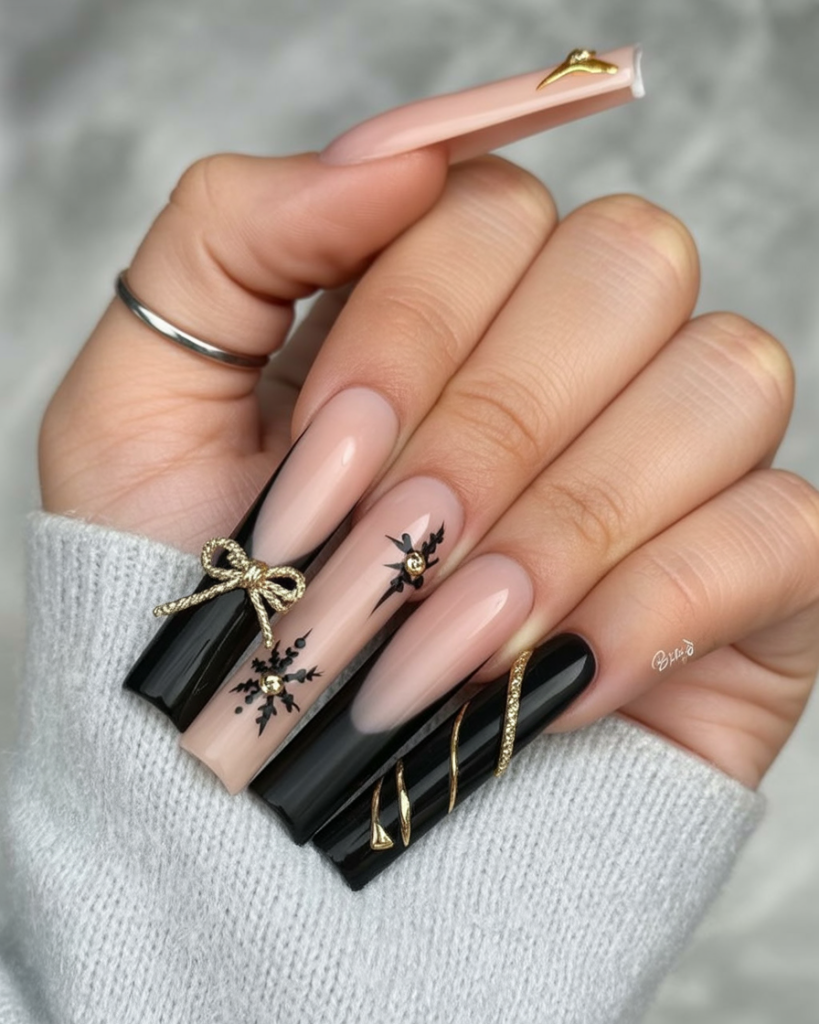 This design pairs nude bases, black tips, and shimmering gold, including accents, that give the look a chic-yet-somewhat-festive feel. The miniature bows, snowflake details, and tiny gold swirls are like little holiday ornaments that wrap luxuriously but subtly around each finger.