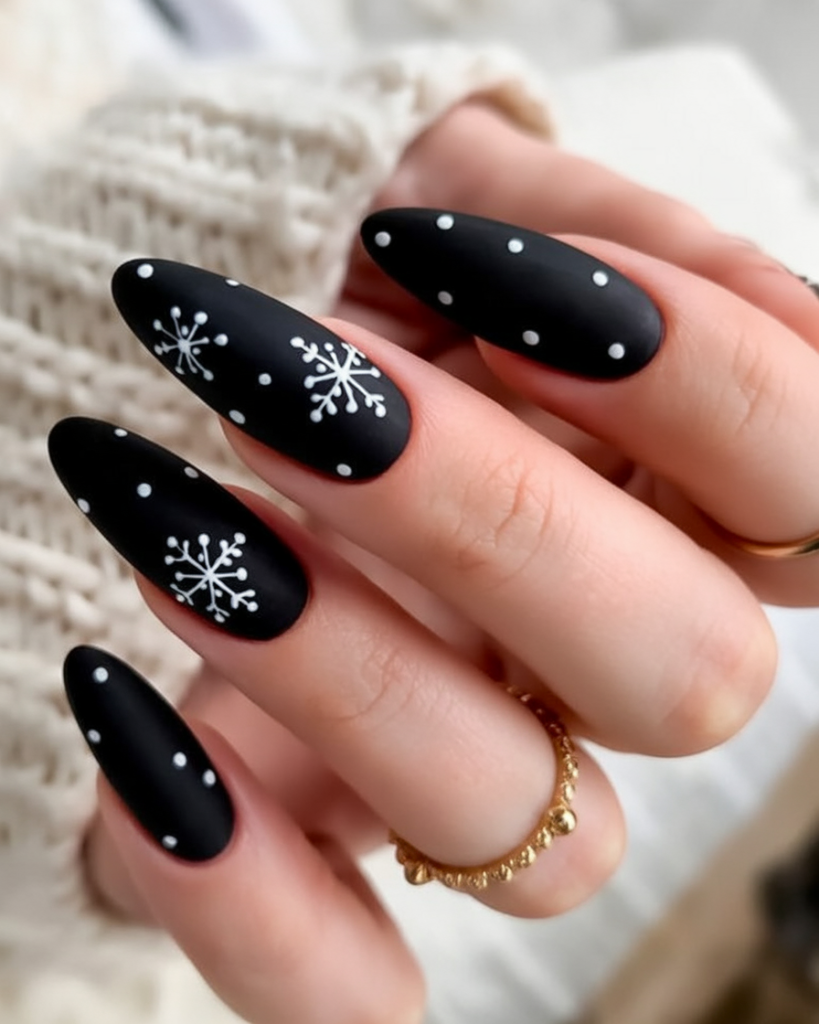 Black and matte–white interspersed by snowflakes and dots is an effortlessly chic look. This whole winter-almond set has an aura of softness: it feels cozy, like watching it snow through the window of a warm cabin. Understated, yet there.