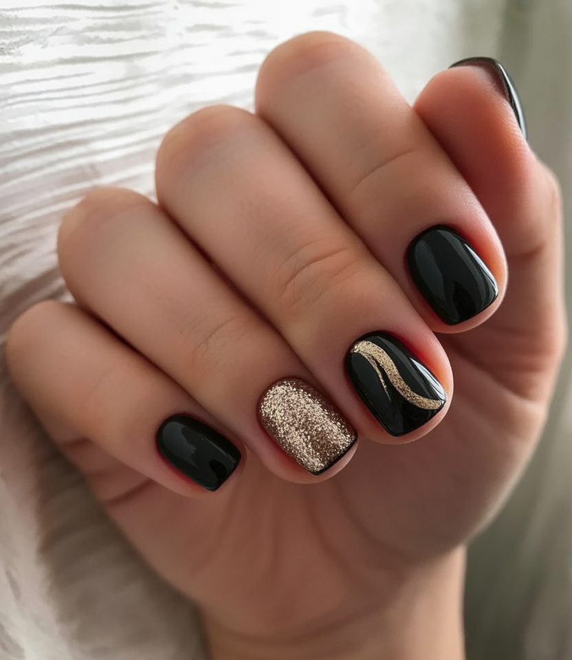 For short nails that really scream drama, this gloss black and gold set is all you! A sparkling accent nail overlaid with sultry golden wavy lines make this one festive and classy at the same time. A timeless design for winters, it also looks fine when paired with casual attire as well as the formal one.