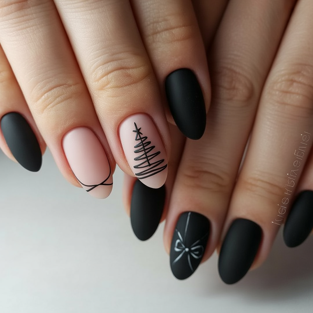 Matte black and soft pink combine in this whimsical design with a line-drawn Christmas tree and delicate bows. It is sleek, graphic, and has just enough festivity without going overboard. Think minimalist holiday décor on your fingertips.