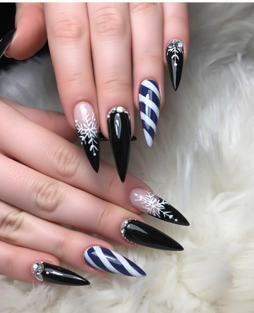 There’s something enchanting about black nails sprinkled with delicate winter snow flake art. The crisp white and blue and striped accents bring a festive twist, while the stiletto shape adds instant edge. Imagine these peeking out from fingerless gloves as you sip hot cocoa at a Christmas market—pure inspo.