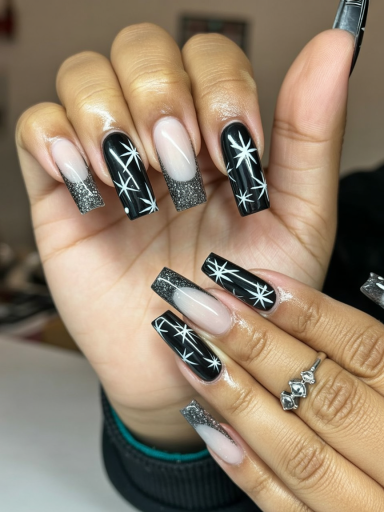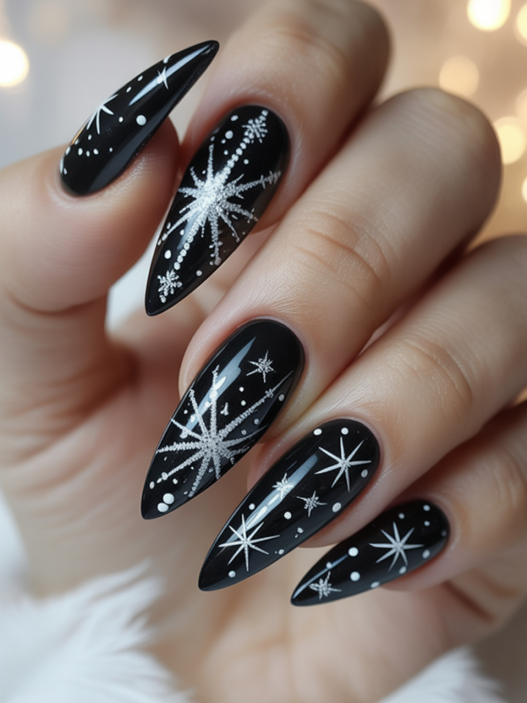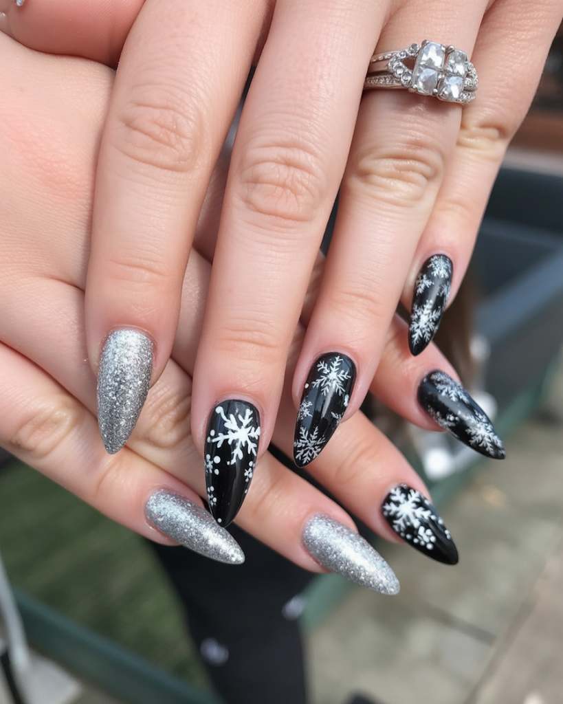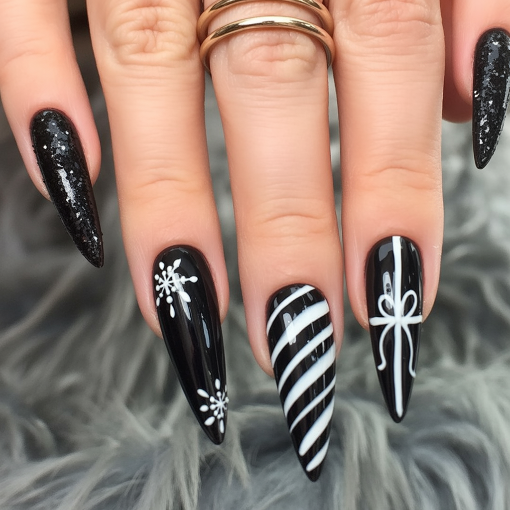 This black and silver and stiletto set is pure winter wonderland. The mix of glittery silver nails with bold black bases and crisp white winter snow flake art instantly transports you to frosty mornings and cozy nights by the fire. It’s dramatic, festive, and effortlessly chic—like a glam holiday party outfit for your fingertips.