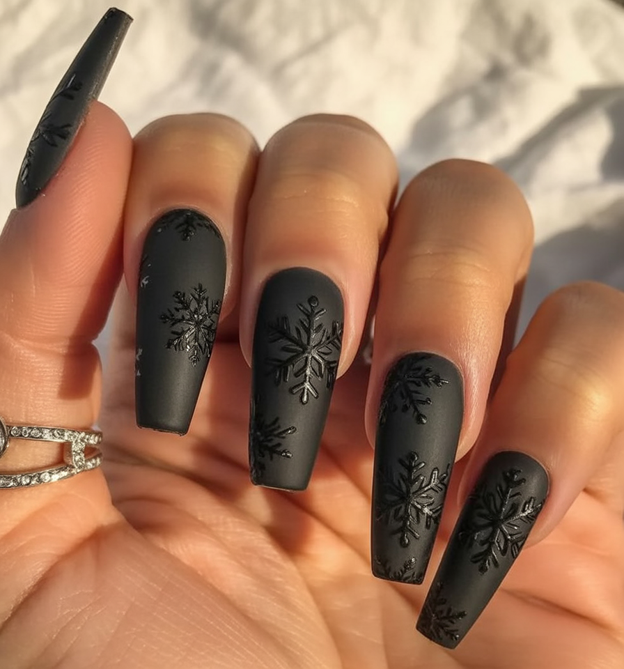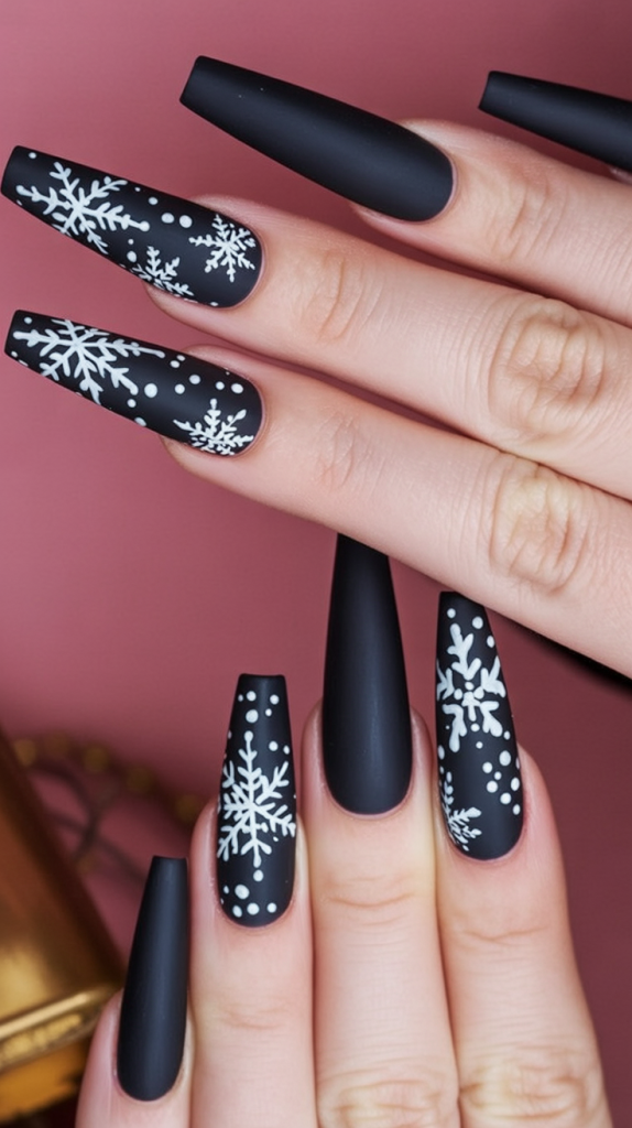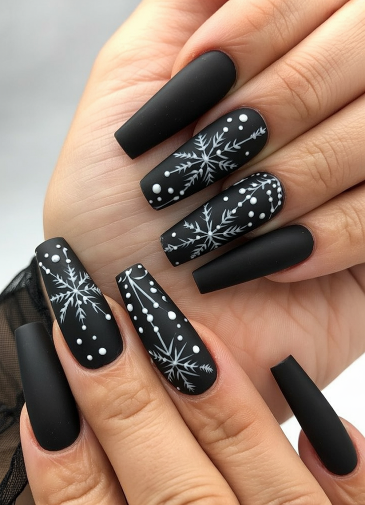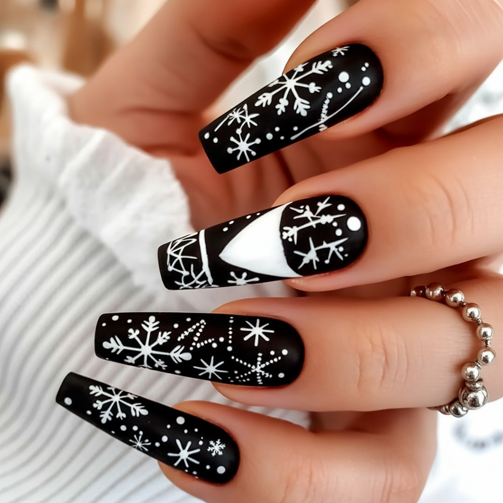 This long matte-black-and-white-snowflakes set is made for drama. The hand-painted snowflakes are spread out over the tips like delicate lace against a dark sky, which gives a really cool winter look. It is an exemplary design for people who want their nails to act as a bold accessory for the winter season.