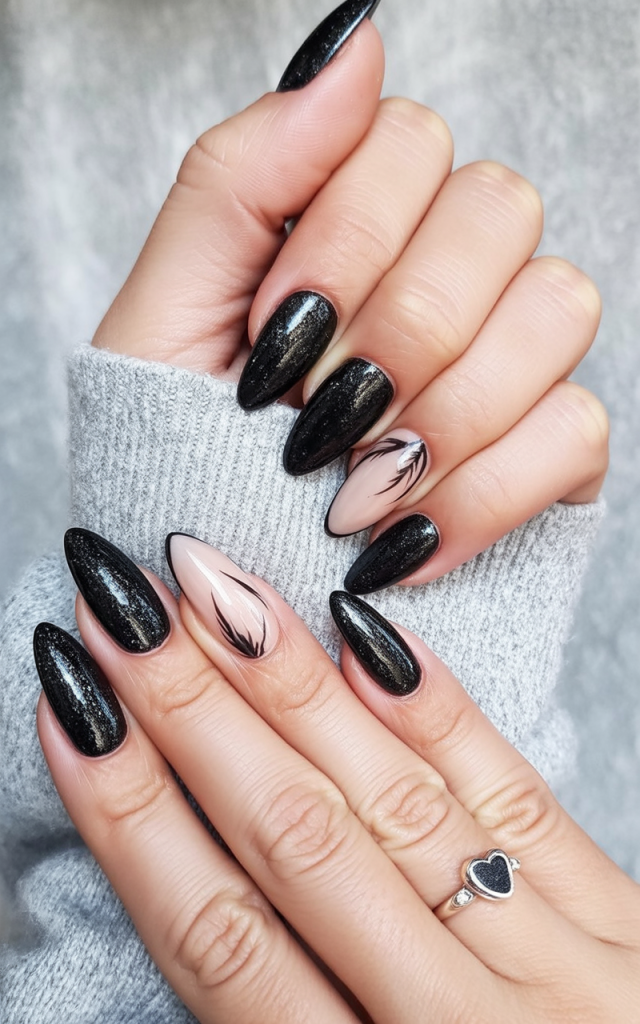 Those designs are very going well with almond nails, creating the illusion of long fingers. These nails go well with a casual attire and also with a more glam set-up for the holiday season, making it a great inspo option for this time of year. A high-shine top coat would intensify the black’s depth, giving the whole set a more luxurious finish.