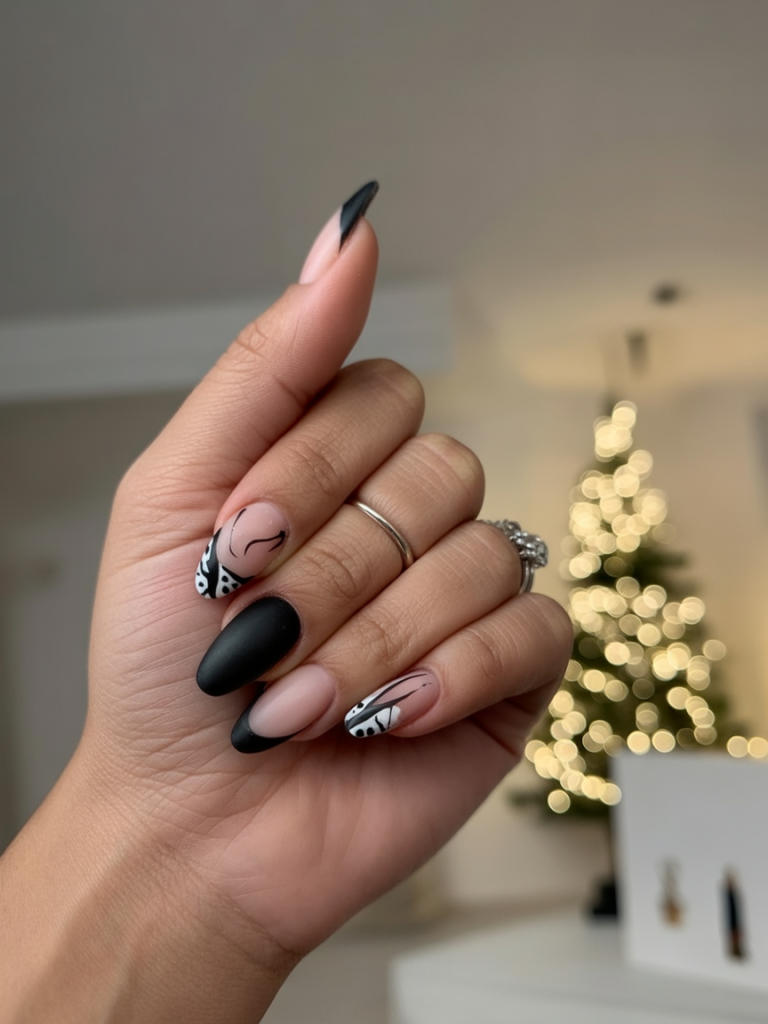 Matte black tips paired with delicate abstract art make this short almond set look effortlessly modern. It’s a subtle nod to the season—perfect for someone who prefers understated elegance over glitter overload. The mix of glossy and matte finishes adds dimension that feels fresh for 2025.