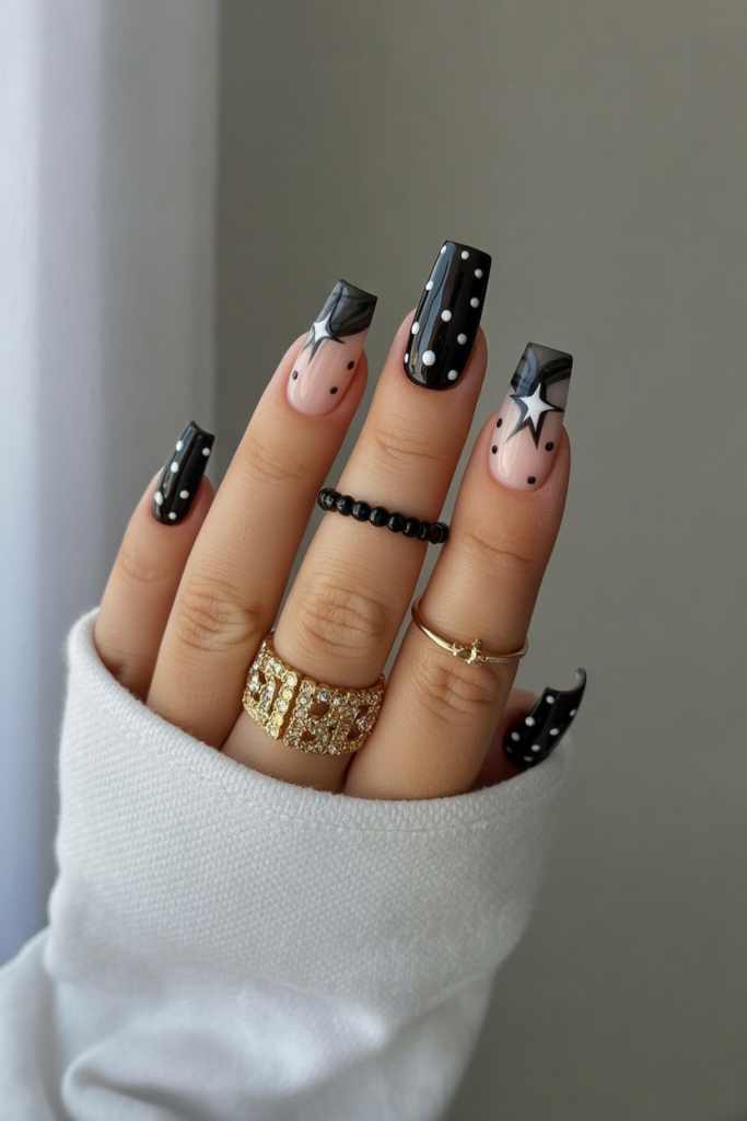 Black nails with star art and white and polka dots? Absolutely adorable. This short square set mixes playful and chic, giving off a celestial winter inspo vibe that’s perfect for holiday parties or everyday wear. It feels youthful yet refined, like the nail version of a little black dress with sparkly accessories.