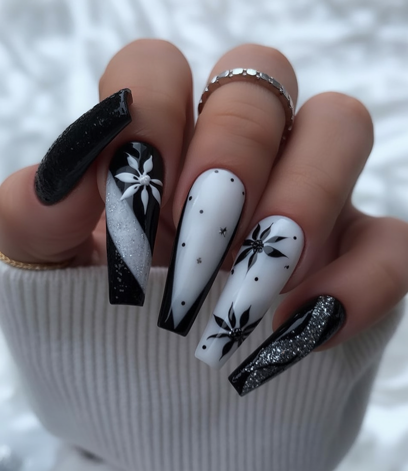This striking black and white and acrylic set gives major holiday inspo with its elegant floral poinsettia designs and clean lines. The contrast between glossy black, pure white, and silver accents feels modern yet timeless—like a luxurious holiday card turned into nail art.