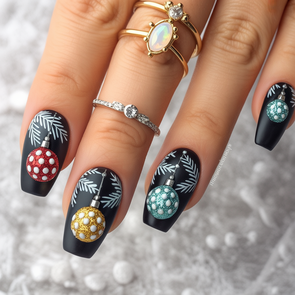 These black nails are bringing the holidays to life with their adorable red and, blue and, and gold and ornament art hanging delicately from white branches. It’s cute, festive, and has a touch of whimsy that makes you smile every time you look at them. Think Christmas tree magic, but mini.