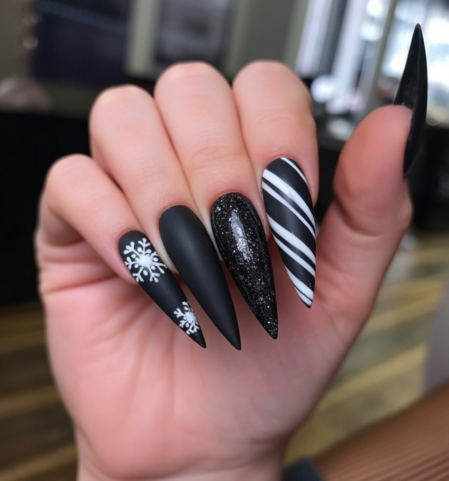 Matte black and glossy black collide in this chic stiletto look, featuring delicate snowflakes and crisp white and candy cane stripes. It’s a modern twist on classic holiday themes—less sweet, more sleek. The balance of textures makes the design feel extra luxurious.