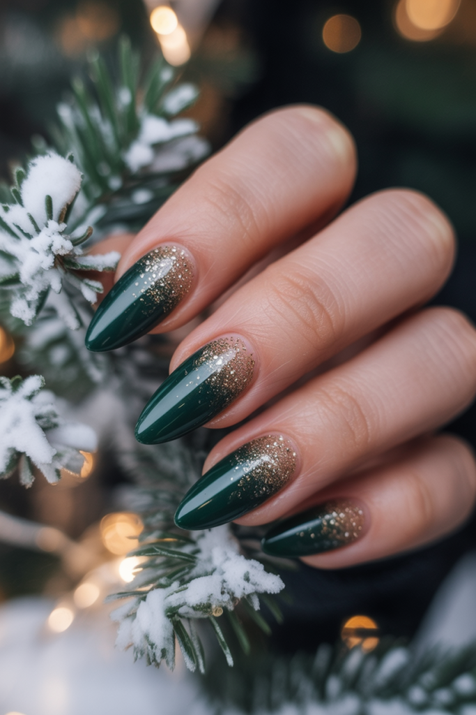 These deep green nails with cascading gold glitter gift you the magic of the holidays in the most elegant way. The almond shape elongates the fingers and accrues timeless elegance that somehow feels a bit bold and very refined. It is a design that intoxicates with the glow of Christmas lights and the classy style of a gift wrapped just right.