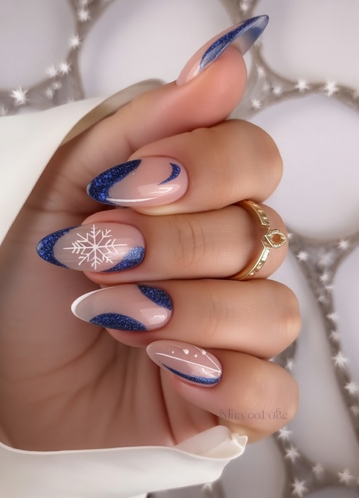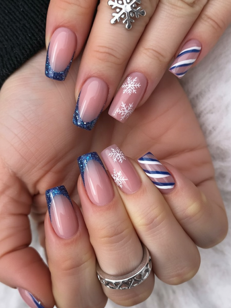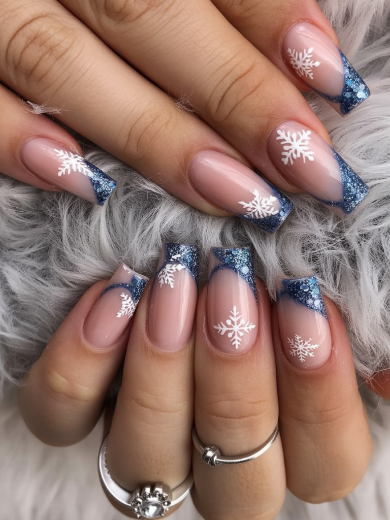 11. Blue glitter French with snowflakes