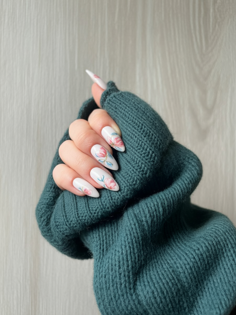 Unexpectedly, it transports delicate roses onto a cold white base, showing that floral art can be just as festive as snowflake art. The almond shape and hand-painted detail come across as rather elegant, almost like a winter bouquet caught in a nail form. It’s undoubtedly a romantic, classy choice for the holidays.