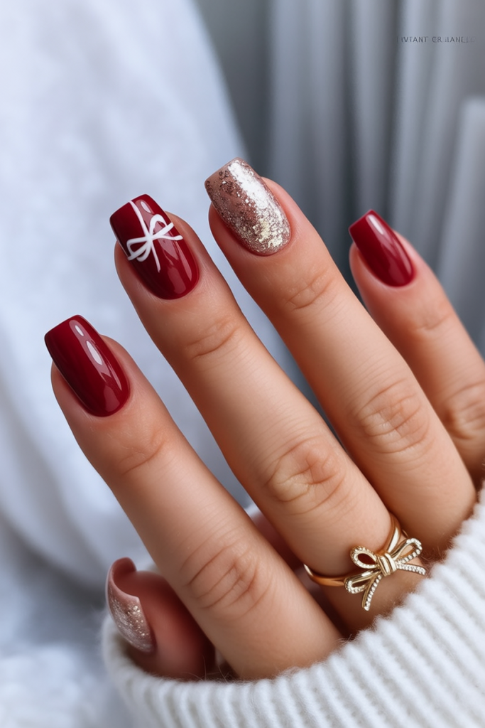 The bold red nail never goes out of fashion, and this design makes the red stand out with a gold glitter accent and crisp white bow. It is glam and playful in one, making your nails part of holiday decor. The square shape brings in the extra drama and sharp elegance.