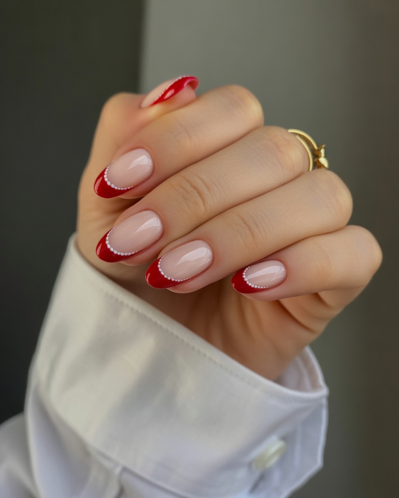 15. Red French Tips with Pearl Detail