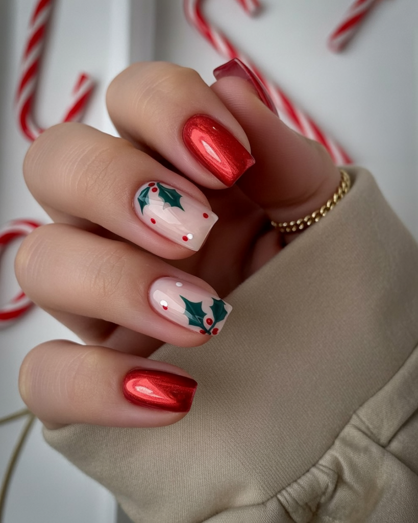 It is an ideal look if you love to make statement nails without the heaviness of busy nail art. The square shape keeps it fresh, while the holly brings in some holiday flair without overpowering it. It is perfect for those who want an elegant yet playful design.