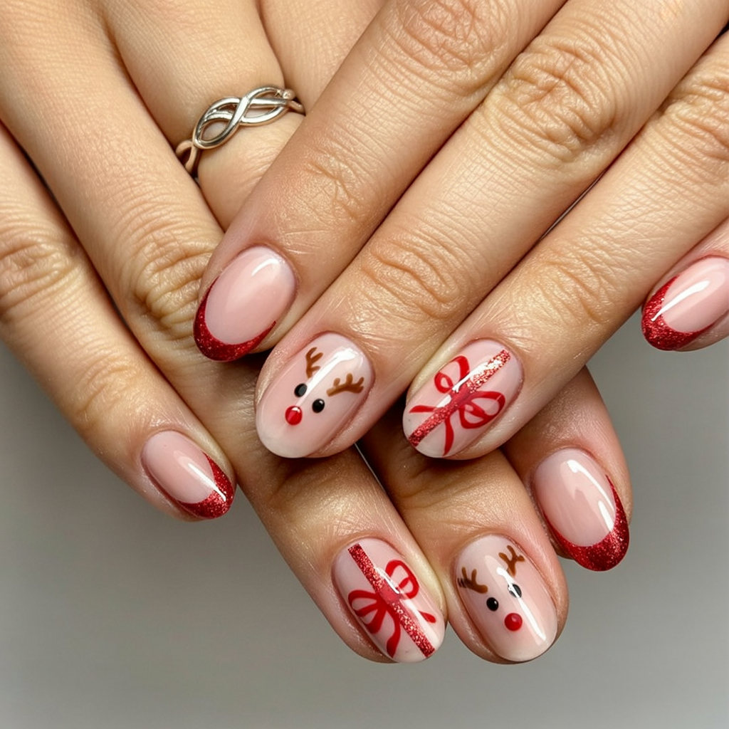 Cute and whimsical, with glittery red French tips and little Rudolph faces with gift-wrap bow accents, this festive design captures the playful spirit of Christmas while remaining polished and wearable.