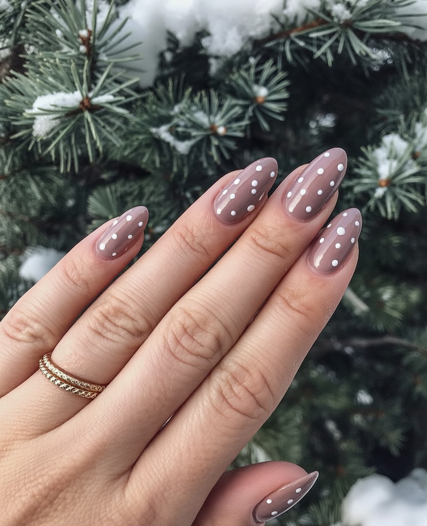 For minimalist holiday nailed fun, a taupe base sprinkled with white dots feels like a gentle snowfall upon your finger tips. It is somehow quite understated, chic, and perfect if you want something subtle but seasonally oriented. The almond shape lends a touch of sophistication to the simple design.