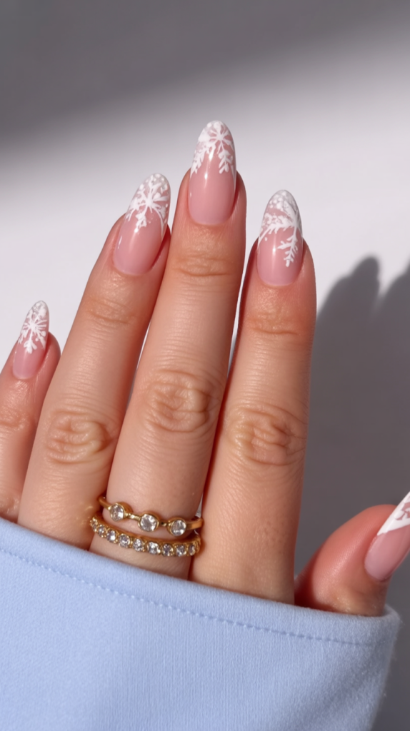 This design is perfect if you prefer something simple, short that still makes a festive statement. The almond shape keeps it classy, whereas a neutral base could go well with every outfit. It is a great low-maintenance choice because chips can hardly be noticed on lighter shades, and the snowflake art provides enough charm to put in a little fun yet remain elegant.