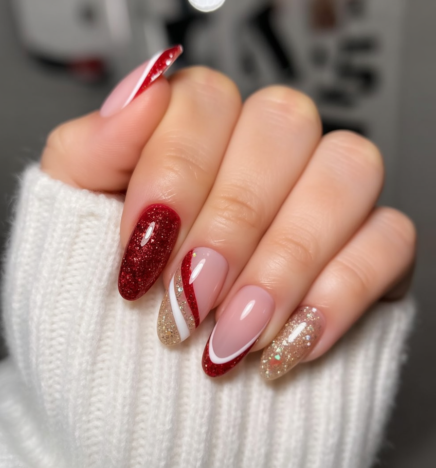 This manicure is pure holiday glam with the wild amount of red glitter, nude bases, gold sparkle, and candy-cane stripes. It is vibrant, stimulating, and festive to the point that it makes every gesture feel like a celebration. The almond shape gives it an elegant touch to complement the fun design.