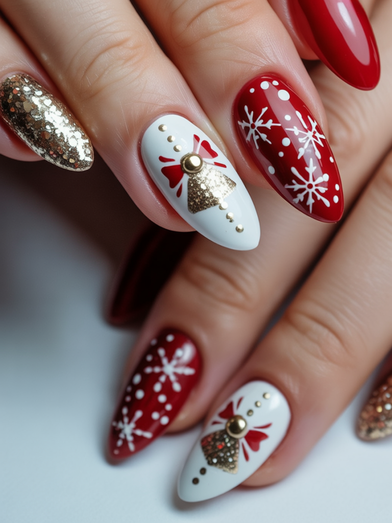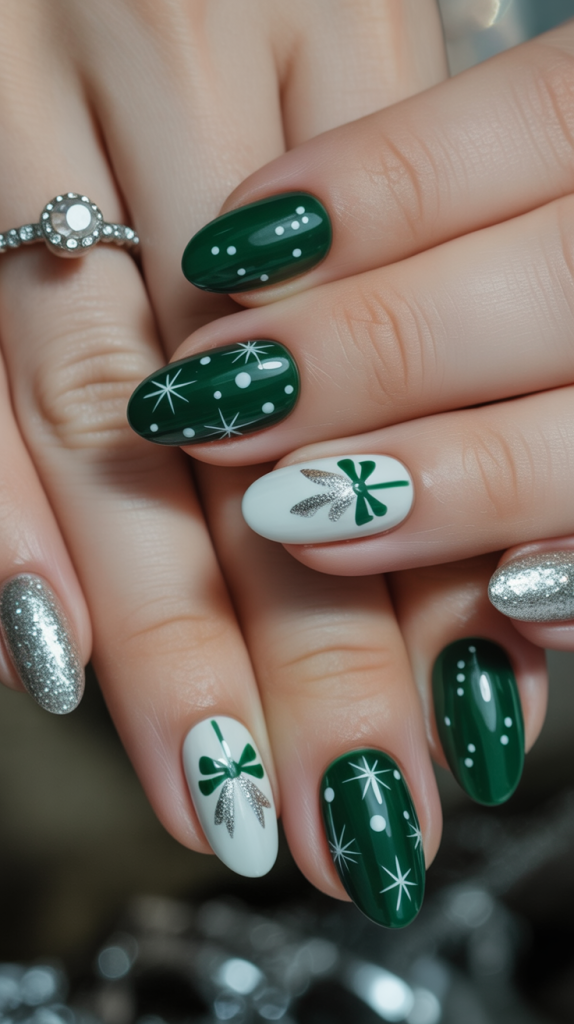 These nails feel like unwrapping a Christmas gift—literally. With a mix of deep green, crisp white, and metallic silver bows, this manicure is festive without being over the top. The playful star and dot art add charm while the almond shape keeps the overall design polished and refined.