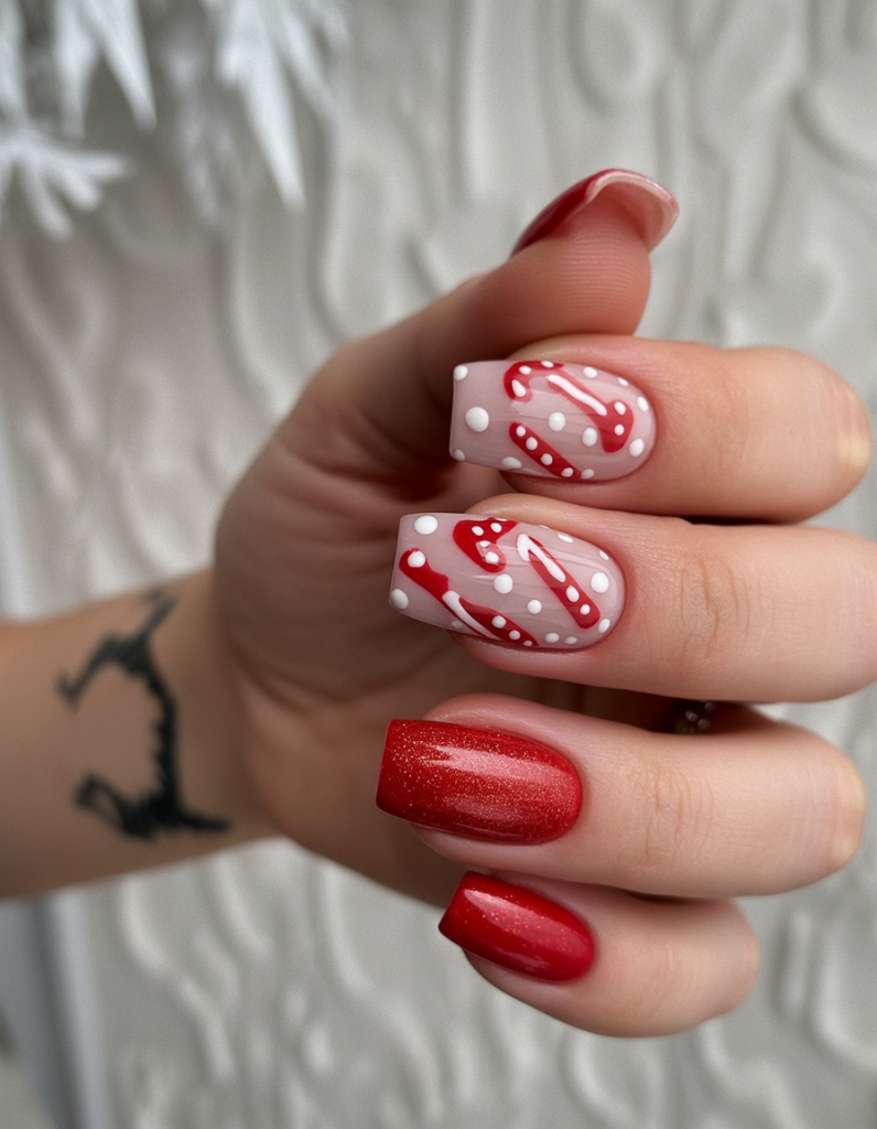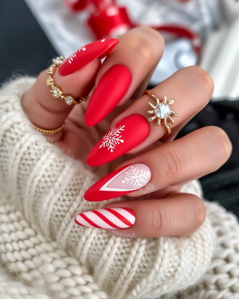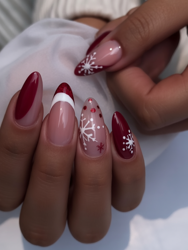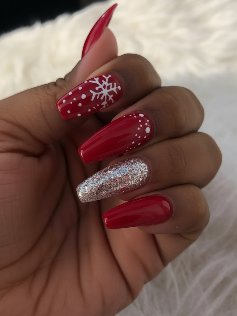 Deep red, snow-white glitter, and nude-pink hues give the manicure a strong and solid representation of the playful snowflake design. Being a combination of solid red, glitter accents, and festive motifs, the design is bold yet balanced and makes each nail seem to be a part of a holiday story.