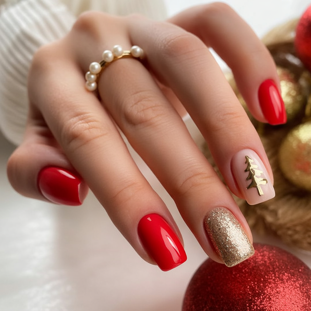 23. Red And Gold Christmas Tree Accent Nails