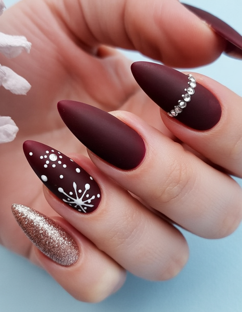 24. Matte Burgundy Almond Nails With Sparkle And Snowflakes