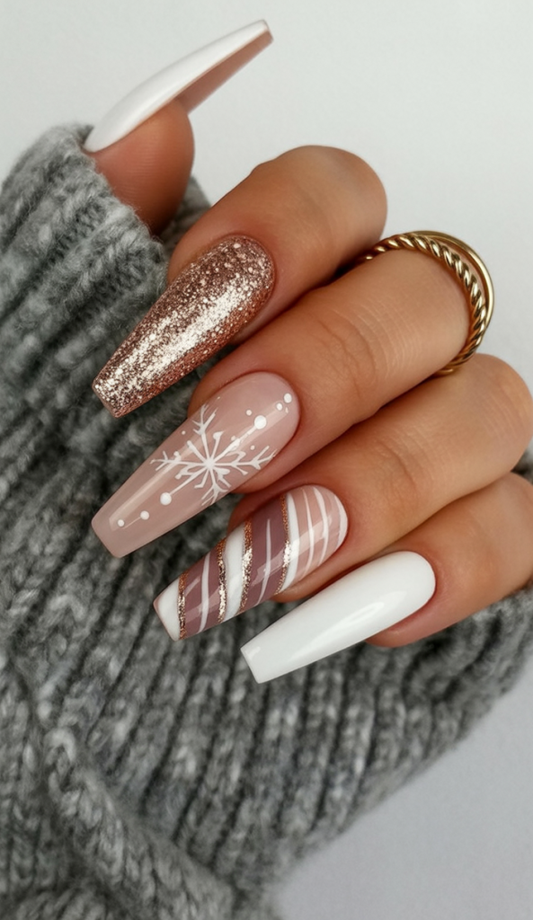 This design blends rose gold glitter, soft pink tones, and crisp white accents into a modern winter wonderland. Coffin nails feature snowflake art, candy-stripe patterns with gold lines, and glossy white tips — creating a sophisticated yet playful holiday look that’s both trendy and timeless.