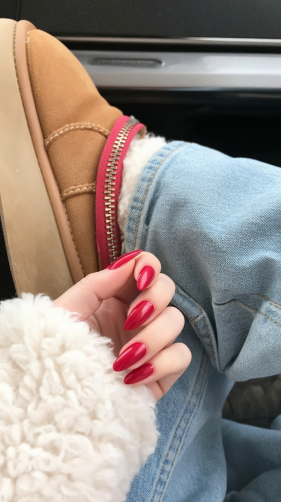 27. Classic glossy red almond nails