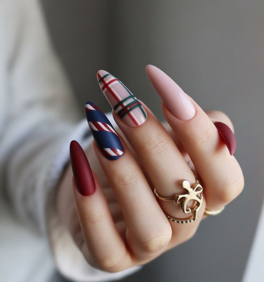 This mix offers traditional holiday design elements with a modern twist on nail art. Deep burgundy matte nails, candy stripes on navy, and classic green and red plaid come together on long almond shapes for a look that boldly moves between chic and masculine. It’s an elegant wink to holiday fashion trends.