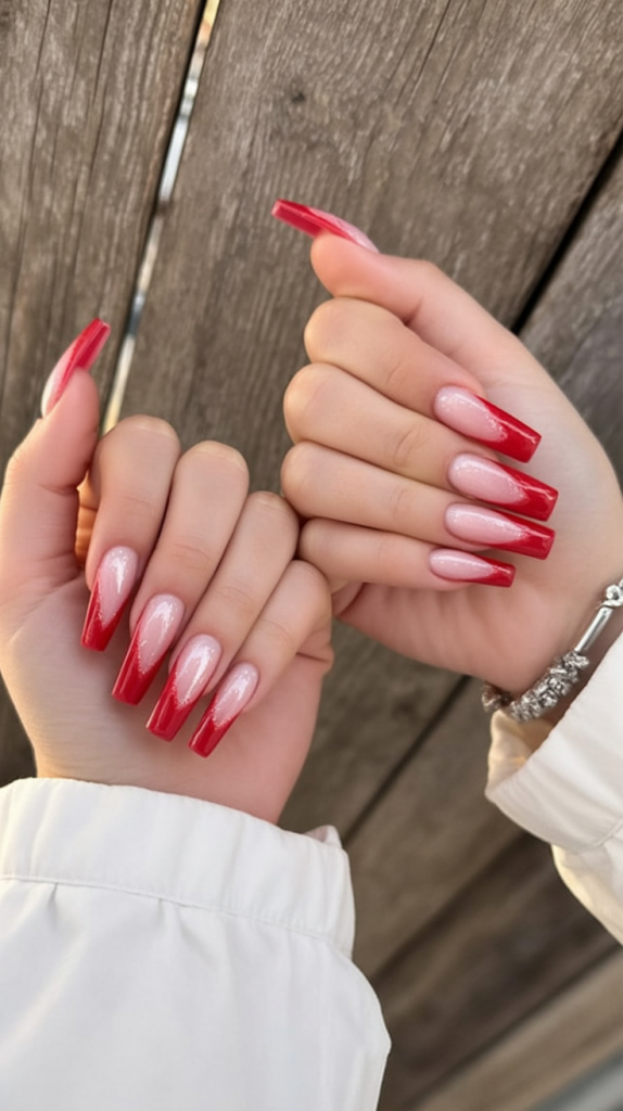 The twistier variant of classic features red French tips with gradient shimmer on long square nails with soft pink bases. It is chicer and more festive with this modern touch and is the best choice for Christmas reunions and New Year’s celebrations.