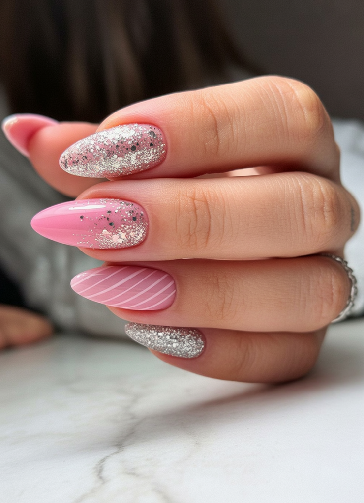 Pink gets the glamorous treatment with all that sparkling silver glitter and candy-stripe accents. It’s fun, playful, and classy all at once, perfect for anyone who wants to party with their nails. The glossy almond shape adds just the right touch of sophistication to balance the fun flair.