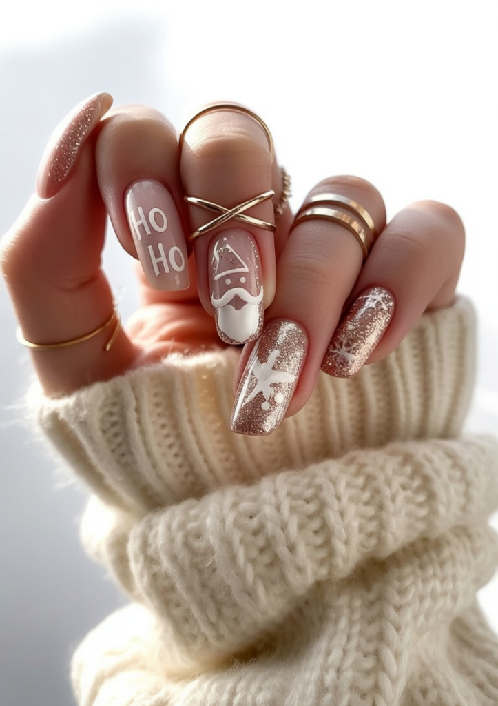 Playful and full of spirit, this manicure mixes rose-gold glitter with cute Santa art and fun “Ho Ho Ho” lettering. It’s the kind of design that makes you smile every time you look down, bringing holiday cheer straight to your fingertips. The square shape adds a polished, trendy edge to the playful art.