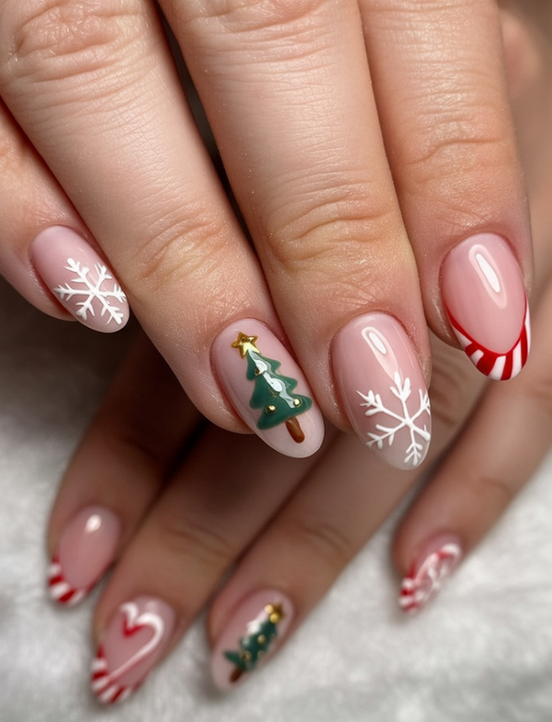 This manicure feels like Christmas morning with its mix of candy-cane stripes, snowflakes, and tiny Christmas trees. The nude base balances out the playful art, making it fun but not overwhelming. It’s joyful, bright, and full of holiday charm, like a festive playlist in nail form.