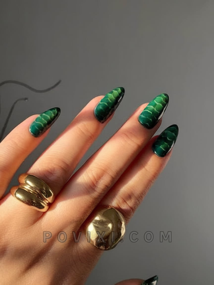 The nail design has an almond shape with a dark green base and textured crocodile skin embossing that creates a unique appeal for fingernails. The shiny finish adds a distinctive, high-fashion edge that suits women who want elegant yet daring nail designs. Pair your forest green nails with earthy outfits or accessorize with gold statement rings for a distinct summer safari style.