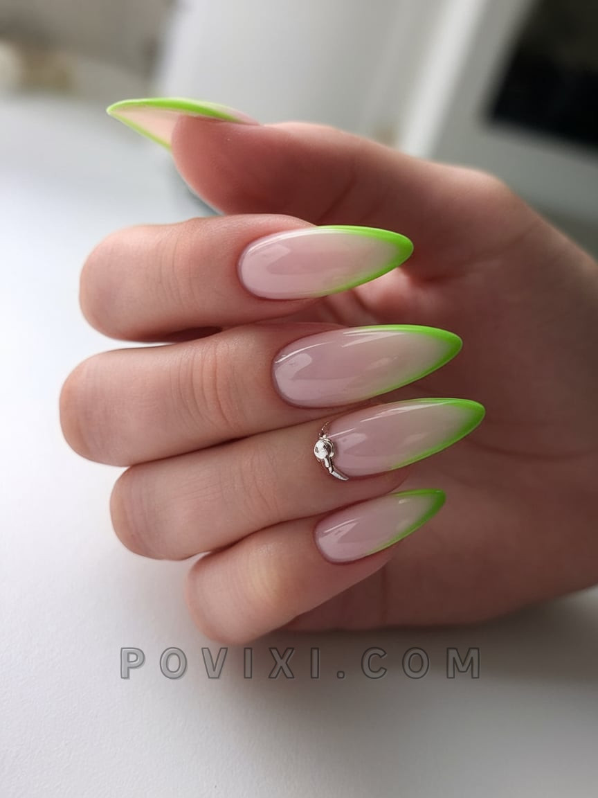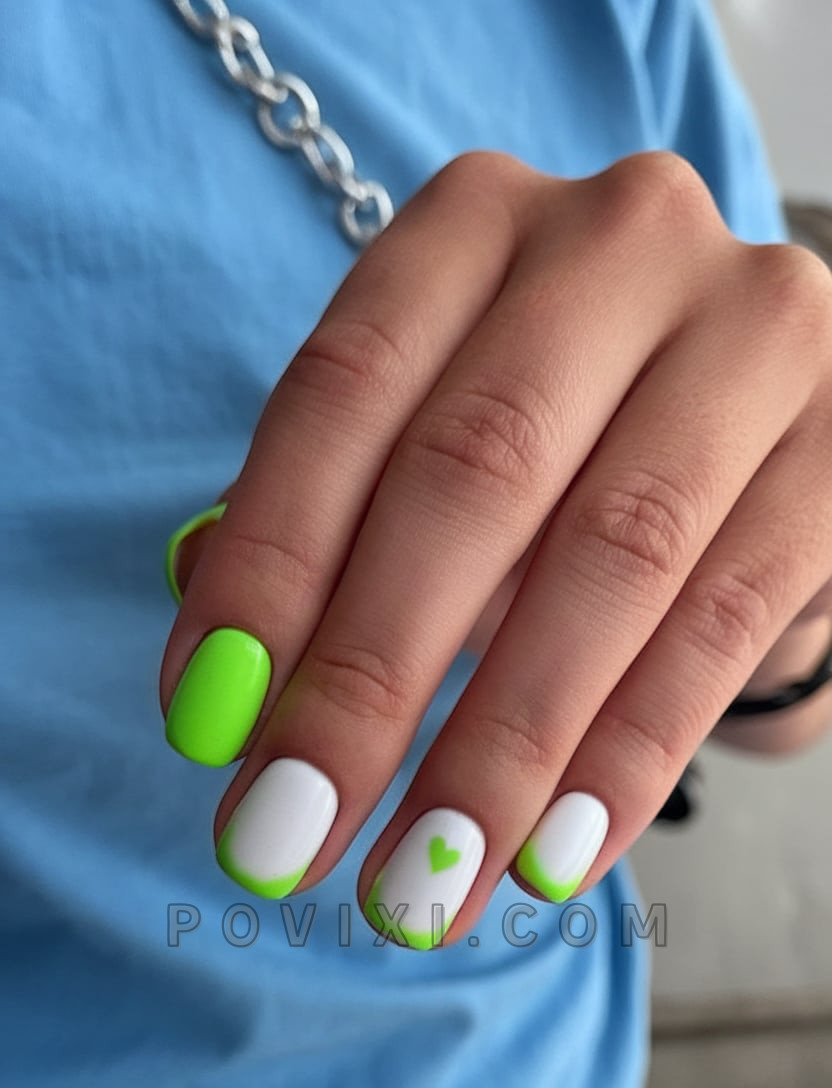 The small square shape of this design creates a youthful appeal that belongs to the green summer nails of 2025. The square design works well on natural nails, but the lime tip combined with a small heart charm creates a magical look. This simple nail design works great with denim shorts, crop tops and statement sunglasses. The stylish nail design brings a playful essence that adds charm to your beach outings and brunch occasions.